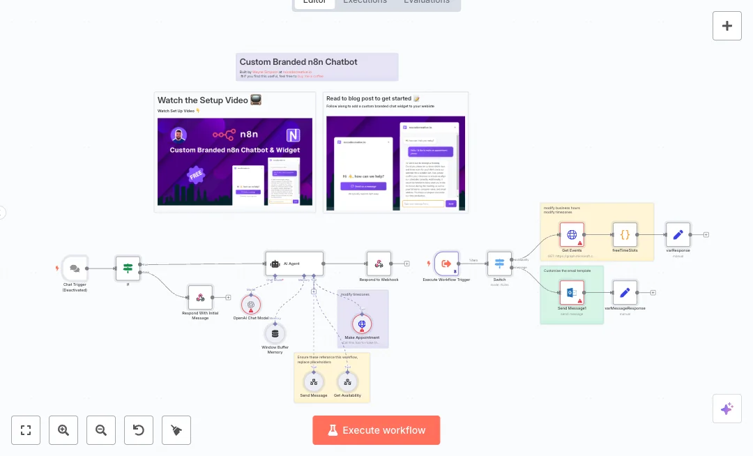 A chat entry starts the flow, sends a friendly greeting, and hands control to an AI agent with short term memory. The agent checks your Microsoft Outlook calendar for the next two weeks, filters busy times, and builds free slots based on business hours. If the visitor is ready to meet, it creates a calendar event through Microsoft Graph with the correct timezone. If they prefer a human, the system emails your inbox with the full inquiry and contact details. The design reduces double booking, keeps context across messages, and returns instant responses inside the chat.