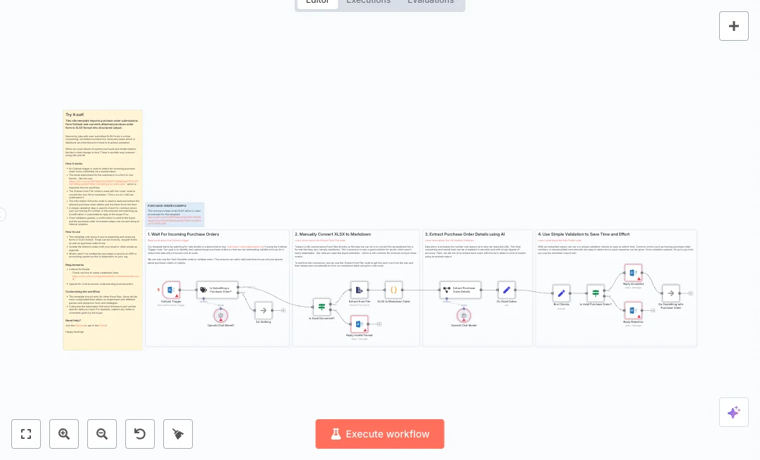 It watches an Outlook mailbox for new emails and uses AI to spot real purchase order submissions. If the attachment is not an Excel file, a polite reply asks for the right format. When the file is valid, the sheet is read into rows, converted into a markdown table, and passed to an AI extractor with a defined schema. Dates are corrected, simple checks confirm the order number and totals, then the sender gets either an acceptance or a rejection message. A final step leaves room to pass the clean data to your ERP or accounting tool.