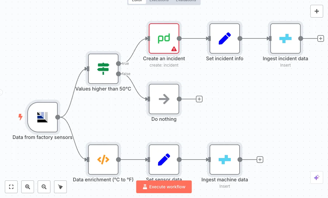 n8n listens to AMQP messages from the berlin_factory_01 queue. A function converts Celsius to Fahrenheit, then a Set node prepares clean fields for storage. Machine data is written to CrateDB. When temperature is 50 C or higher, a PagerDuty incident is created and its id and link are saved to CrateDB, otherwise the normal path does nothing.