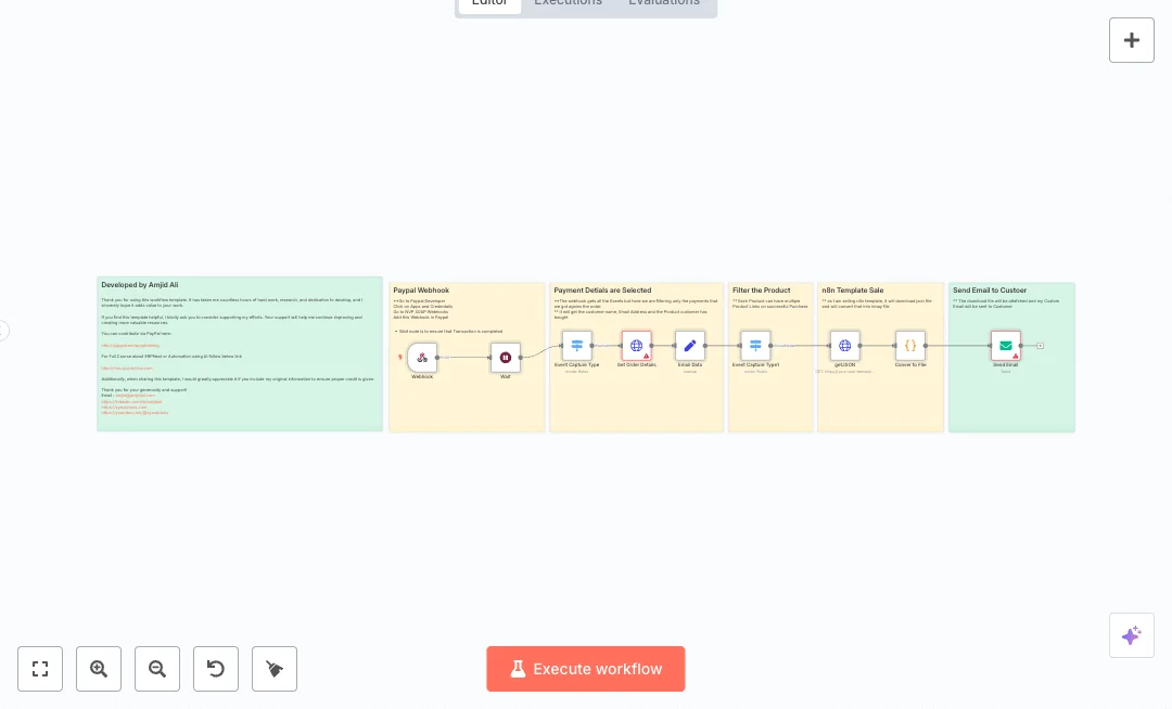 Set up a PayPal app and webhook, then connect OAuth in n8n for the order details call. Replace the placeholder file URL, add your SMTP email credentials, and adjust the product rules to match your items. Expect delivery to move from hours to seconds and handle more orders without adding staff. Ideal for selling n8n templates, JSON assets, keys, or any digital file.
