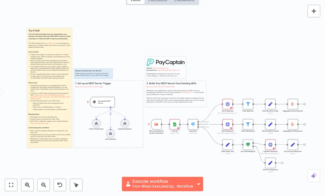 An MCP server trigger exposes three tools to your agent client: search employees, get employee by ID, and update employee. A switch routes each call to the right path. The workflow calls the payroll API with pagination, filters results, and strips sensitive fields before sending data back. Updates run through a field allowlist and a guard check, then the API is called to apply changes. Every request and response is written to Google Sheets for traceability, and clear success or error messages are returned.