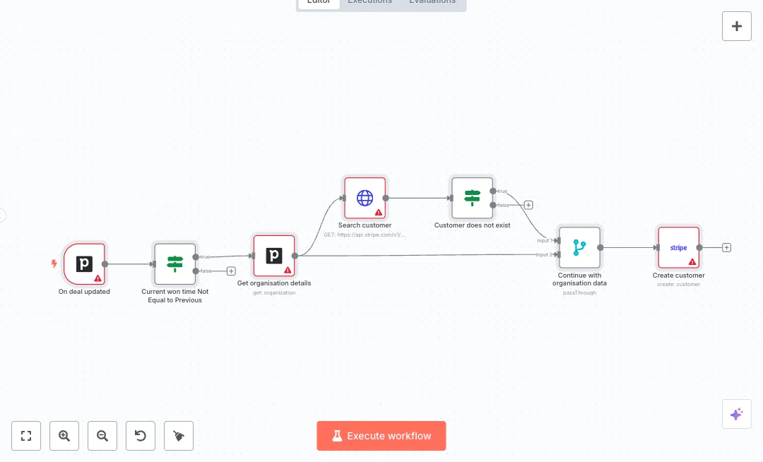Here is how it runs end to end. An event from Pipedrive watches for deal updates and checks if the won time changed. When that happens, the flow pulls the linked organization details from Pipedrive. It then searches Stripe for a customer with the same organization name. If no match is found, a merge step allows the process to continue to Stripe and creates a new customer with mapped fields like name, street, house number, city, state, and country. This reduces duplicate records and ensures billing data is ready as soon as the deal closes.