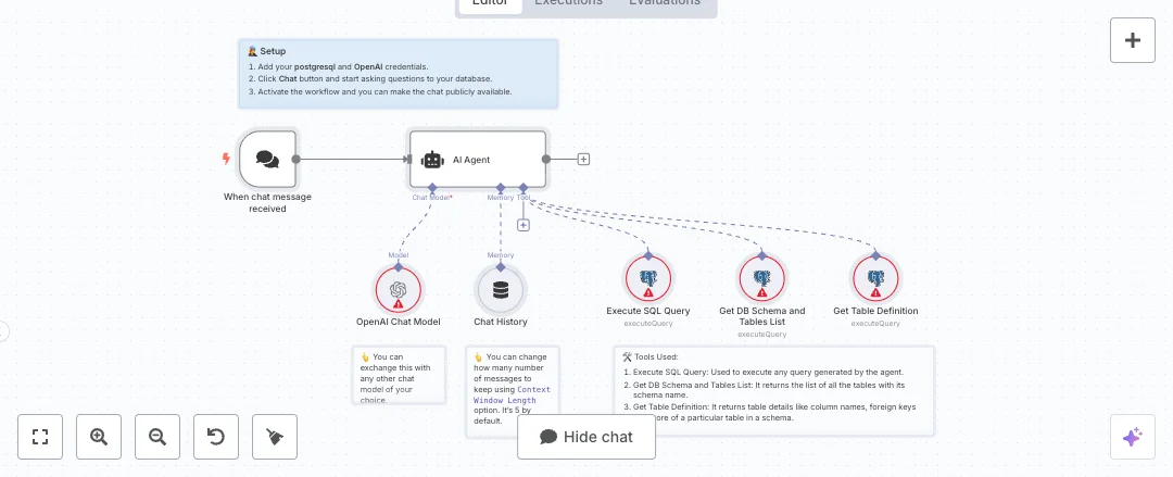 Setup needs an OpenAI API key and PostgreSQL credentials. Use a read only database role for safety, and adjust the memory window if you expect long chats. Expect fewer ad hoc requests to your data team and faster daily checks. Use it for KPIs, inventory snapshots, or customer lookups through a simple chat link.
