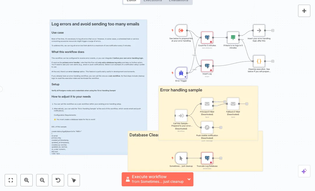 Errors trigger the run directly or through a call from another workflow. One branch writes full error details into the N8Err table in PostgreSQL. Another branch counts how many rows were created in the last five minutes. An If check allows notifications only when the count is zero, so the first error opens the window and later errors are only logged. Email alerts use a primary SMTP sender with a fallback sender. A Pushover push can notify mobile devices. A manual trigger clears the table for development only. A small code step cleans the execution when used as a sub workflow.