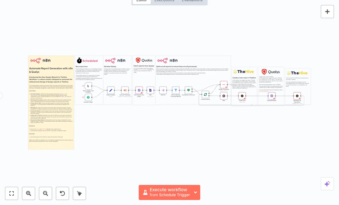 You will need credentials for Qualys, TheHive, and the n8n API. Set the base URL to match your Qualys platform and confirm the helper workflow used for timestamp storage is connected. Expect faster handoffs, fewer missed reports, and a clean record of scans for audits and compliance across your security team.