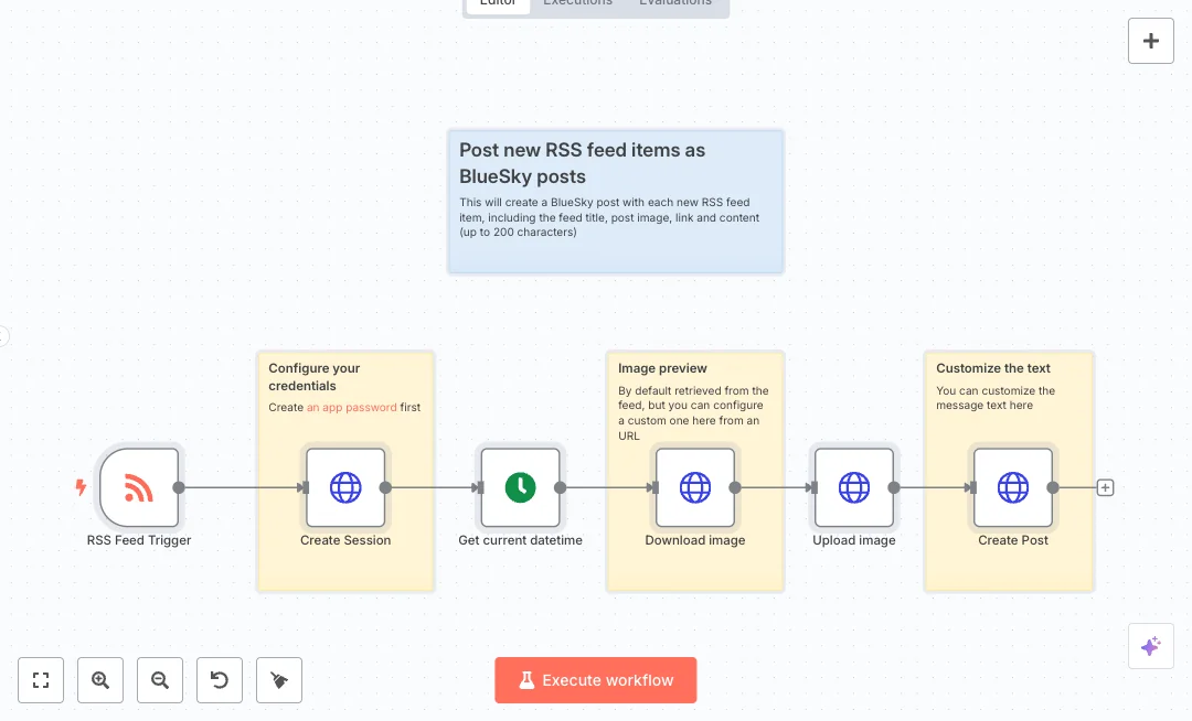 To set it up, you need a Bluesky account and an app password. Add your RSS feed URL and your Bluesky username and app password in the Create Session node. Expect faster distribution, consistent posting, and less manual copy and paste. Ideal for content teams, solo bloggers, and marketing managers who want simple, reliable distribution to Bluesky.