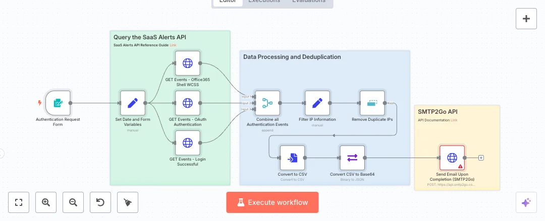 Here is how it works. A form trigger captures email and date values. The flow then calls three SaaS Alerts endpoints for login success, OAuth authentication, and Office 365 shell activity. All events are merged, only the useful fields are kept, and duplicate IP addresses are removed. The data is turned into a CSV, encoded, and sent with SMTP2GO as an attachment. This gives a ready to share report in a standard format. Large pulls are supported with a size setting of up to ten thousand events per call.