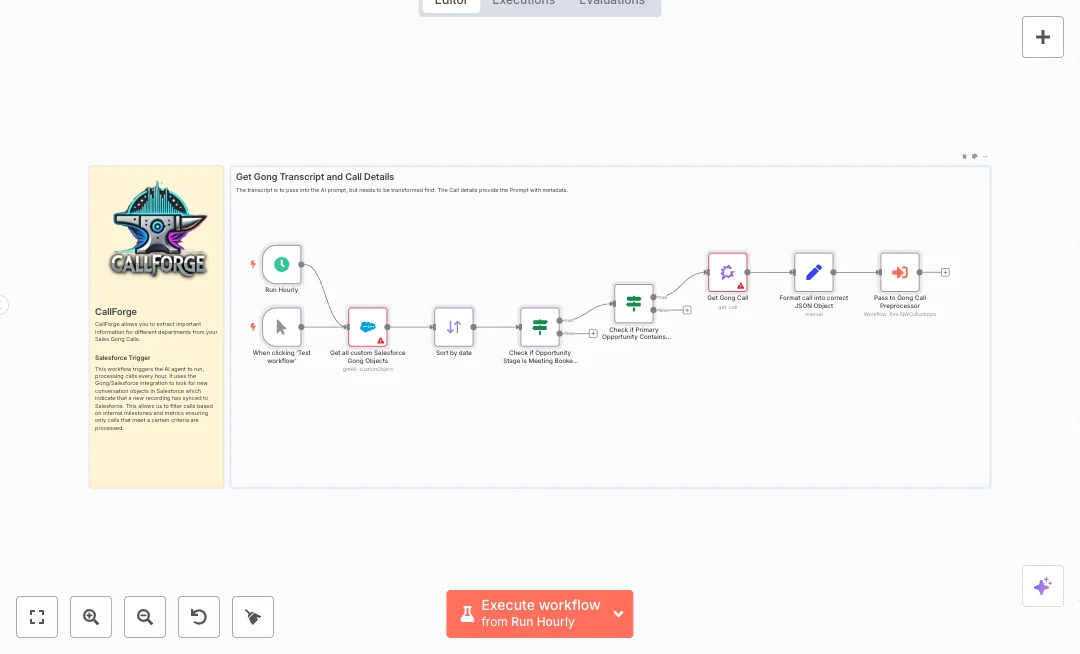 Turn your sales calls into clear data without manual work. The flow checks Salesforce every hour for new synced Gong calls and sends only the ones that matter into processing. It fits sales and revenue teams that want faster insights from early stage calls.