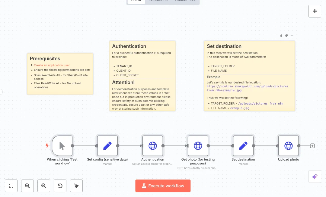 You will need an app in Microsoft Entra ID with Sites.ReadWrite.All and Files.ReadWrite.All permissions. Store secrets in n8n credentials, not in a Set node, when you go live. Expect faster uploads, fewer folder mistakes, and a single place for images. Useful for marketing asset drops, event photos, and internal image handoffs from field teams.