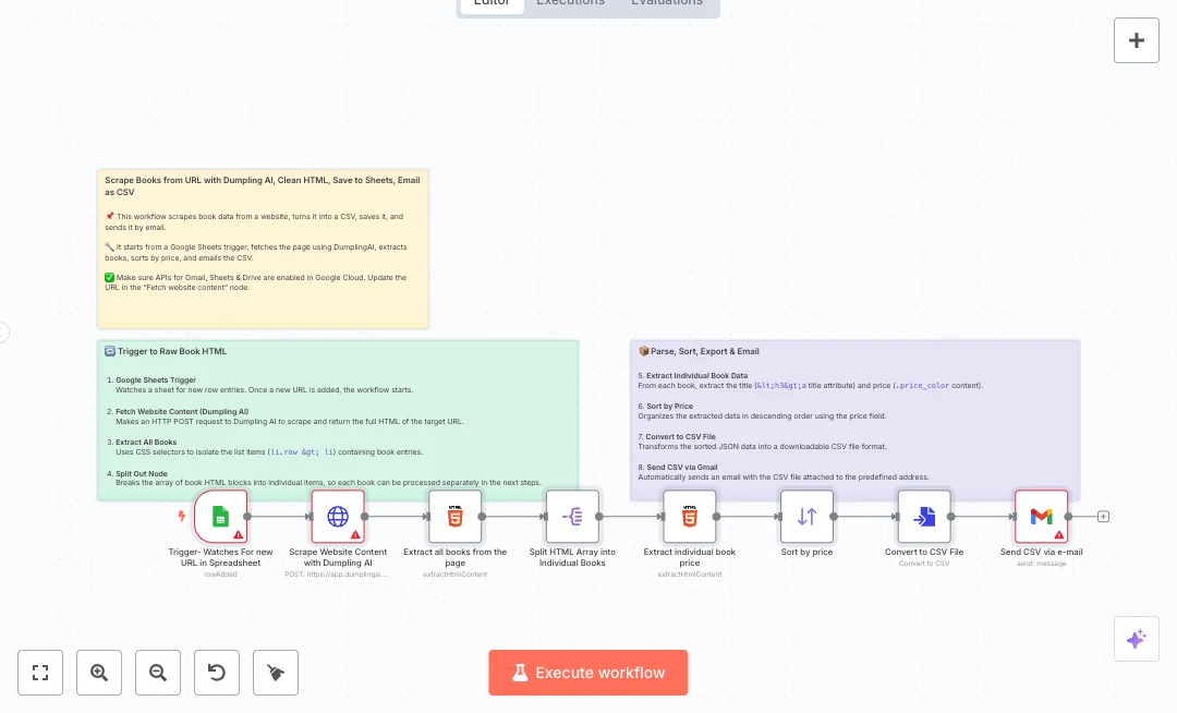 When a new row appears in the sheet, the flow calls a scraping service to pull a clean HTML copy of that page. The HTML parser finds each book block, then a split step handles one item at a time. It captures the title and price, sorts all items from high to low, and turns the list into a CSV file. Gmail sends the CSV with a short note so your team can review and share right away. The system checks the sheet every minute, so new links get processed fast. You can change the sort or add more fields as your needs grow.