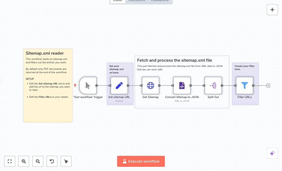 Here is how it runs from start to finish. A manual trigger starts the run. A Set block holds one field called sitemapUrl. The HTTP Request block pulls the sitemap file from the web. The XML block converts the XML into JSON and normalizes the keys so they are easy to read. Split Out breaks the urlset.url array into single items. The Filter block returns only links that match your rules. Out of the box it focuses on .pdf links, which is great for asset audits.