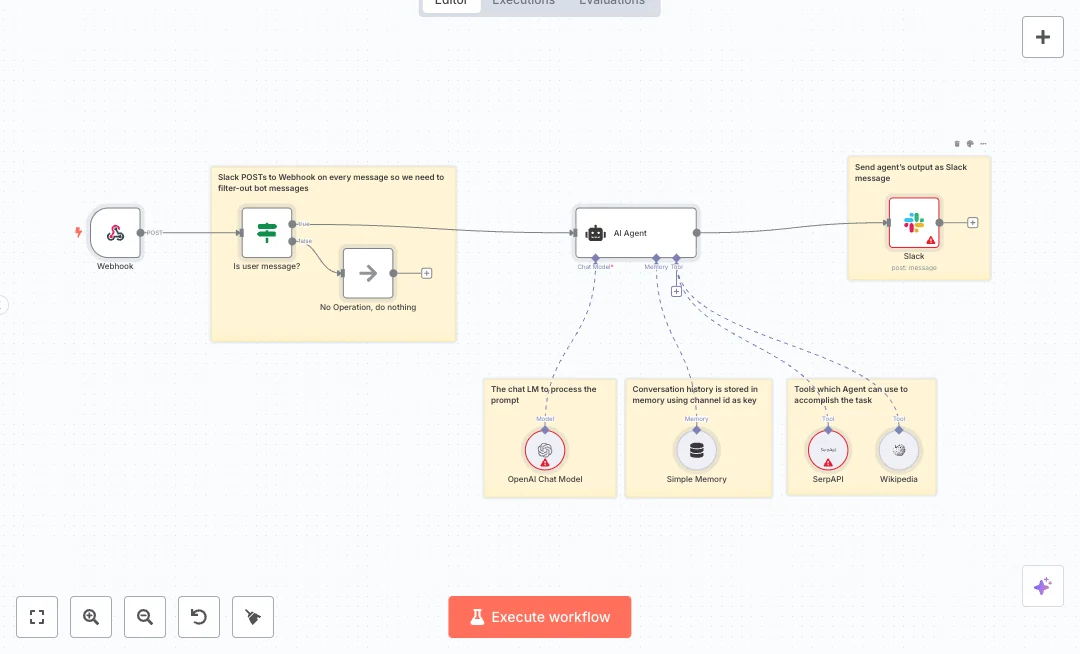 It listens through a secure webhook that Slack calls on each message. A filter checks every event and ignores posts from bots to prevent loops. When a real user types, an AI agent uses an OpenAI chat model with short term memory tied to the Slack channel, so it remembers recent context. The agent can look up facts with SerpAPI and Wikipedia, then sends a direct reply to the user through Slack. This design keeps channels clean while still giving quick support.