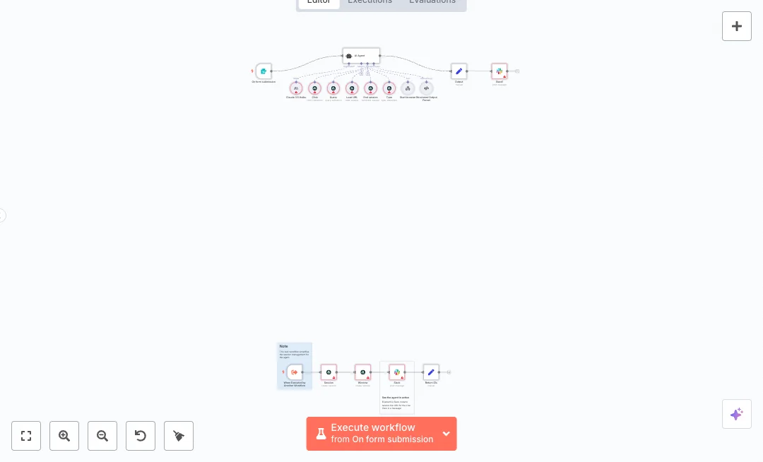 Behind the scenes, a form event or a call from another n8n workflow passes the prompt to an AI Agent powered by Claude 3.5 Haiku. The agent controls a remote browser through Airtop tools to start a session, open a window, load a URL, click, type, query the page, and then end the session. A structured output parser keeps the results clean. Slack posts the live view link so teammates can watch, and a summary arrives when the run finishes. Session and window IDs are also returned for traceability and reuse.