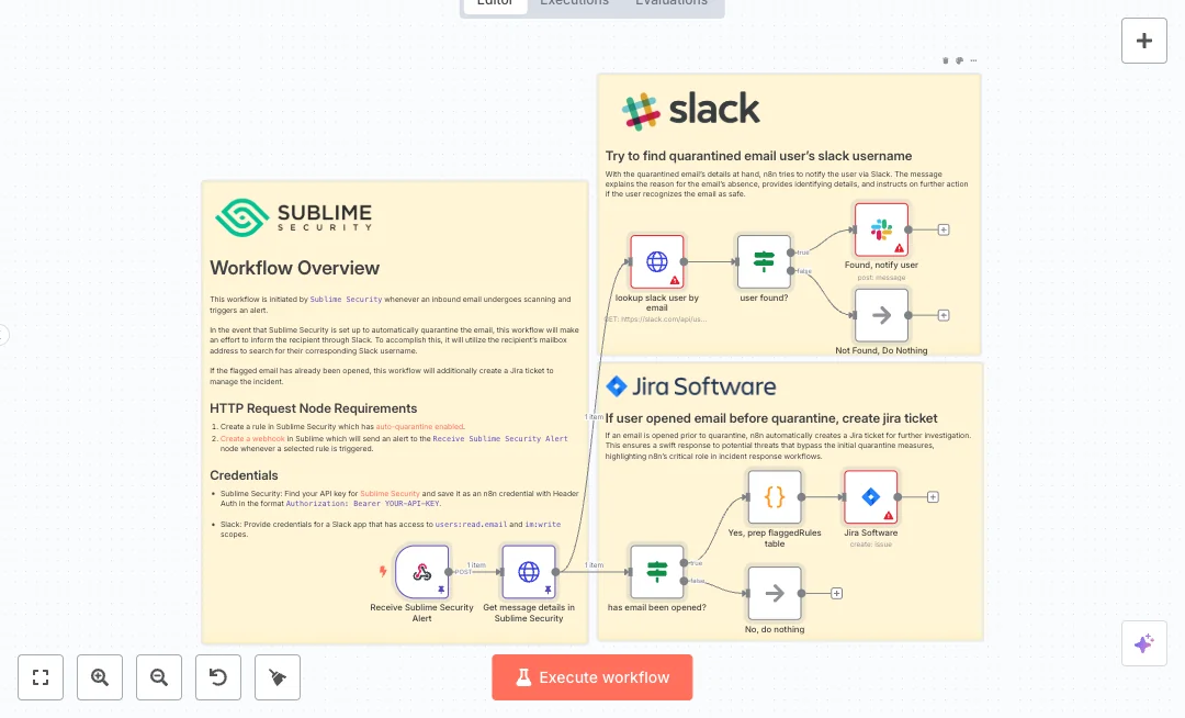 An incoming alert from your email security tool triggers a webhook in n8n. The flow pulls message details, then looks up the recipient’s Slack account by their mailbox address. If a Slack user is found, a direct message explains why the email is missing and what to do next. The logic also checks if the email was opened using the read at field. If true, a code step prepares a table of flagged rules and a Jira issue is created with a clear summary and description. If the user is not in Slack or the email was not opened, the flow exits without noise.