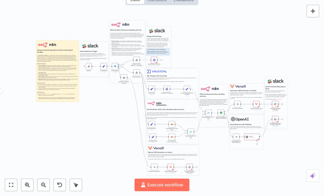Incoming Slack events reach n8n through a webhook. The flow parses the payload, opens a Slack modal, and responds quickly so Slack does not time out. After submission, the workflow closes the modal, looks up the requester’s Slack email and team details, and scans the domain with VirusTotal. Results and context are merged. If no malicious reports are found, a Venafi TLS Protect Cloud node generates the CSR and issues the certificate. If risk is detected, OpenAI writes a short summary and a Slack message asks for manual approval. A domain format check runs before the request is sent.