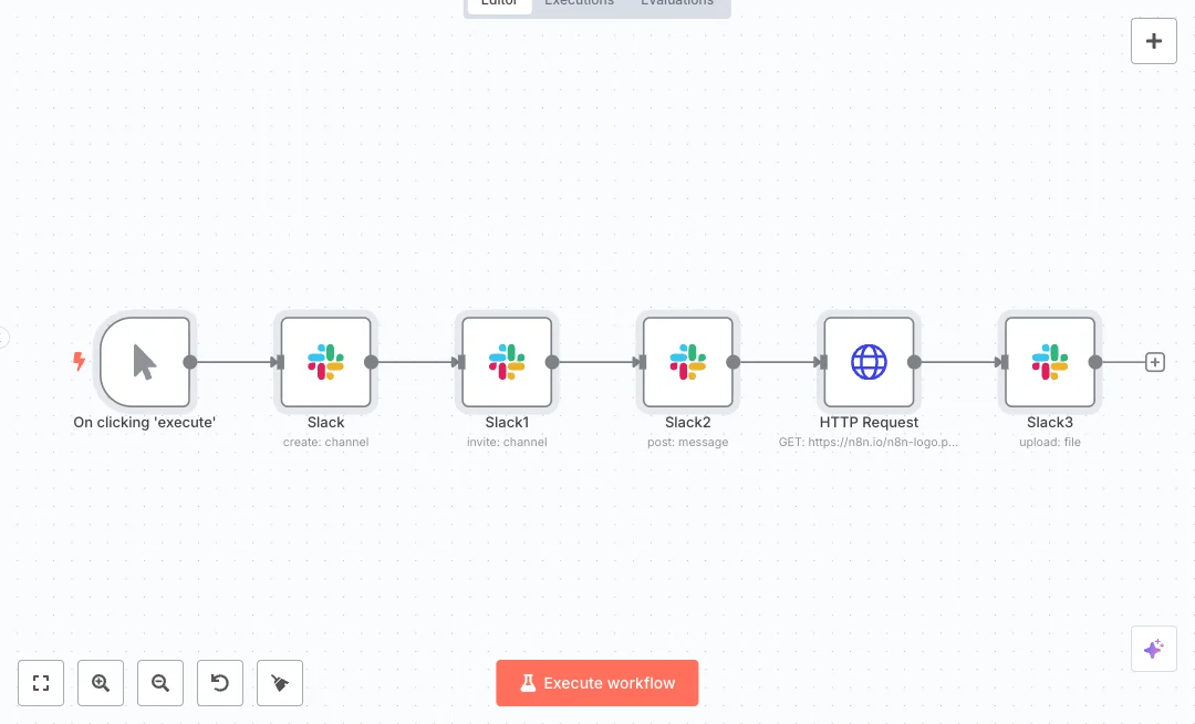 Execution starts with a manual trigger for full control. The first Slack step looks up the target channel and returns the real channel ID. The next Slack action invites a specific user by their Slack user ID, then posts a friendly welcome message as the bot user, including an image shown from a public URL. After that, an HTTP Request downloads the same image as a file, and the final Slack file step uploads it to another channel by its channel ID for archiving or asset sharing. This sequence ties together channel management, messaging, and file delivery without switching apps.