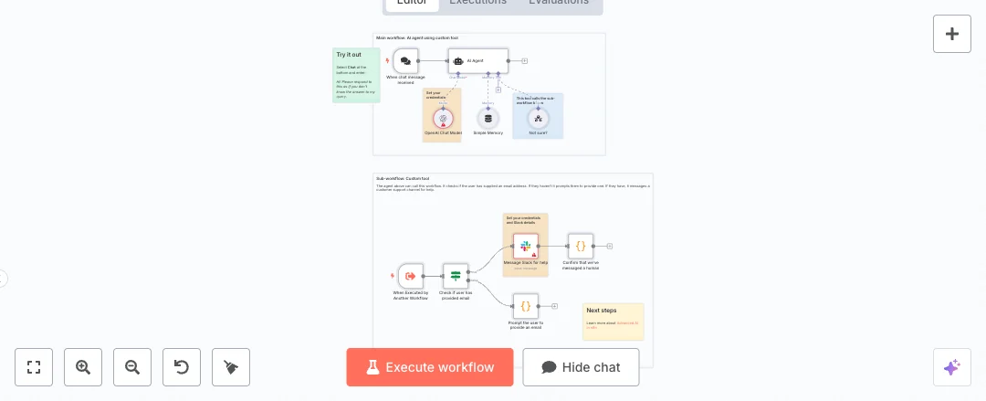 Incoming chat messages start the agent. It runs on an OpenAI chat model with short term memory to keep the conversation on track. When the agent is unsure, it uses a custom tool that calls a sub workflow. That sub workflow checks if the user included an email. If yes, it posts the full message to a Slack channel and confirms that a human was notified. If not, it prompts the user to share an email so your team can reach them. This flow reduces dead ends, keeps the chat friendly, and moves the right items to people.