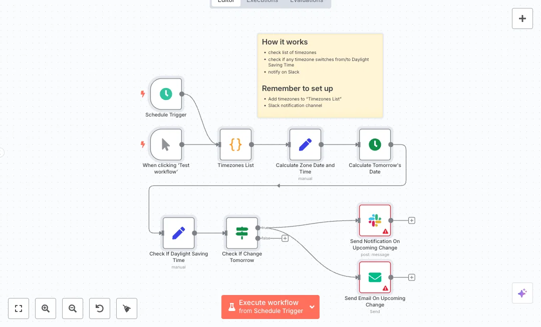 A daily schedule runs the check. A Code node holds your time zone list. The flow calculates current time per zone, computes tomorrow, and then checks if the zone is in daylight saving time today and tomorrow. An If step compares the two states. When a change is coming, a Slack message posts to your chosen channel and an email is sent with the same message. You can also run it by hand with the manual trigger for quick tests.