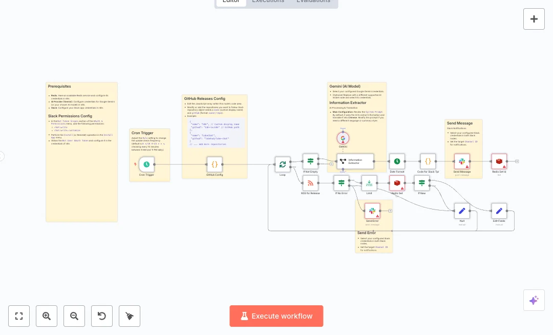 A timed trigger runs every 10 minutes during work hours. A code node holds the list of repositories you care about. For each repo, the RSS reader pulls the latest release item. Errors route to a dedicated Slack channel. Redis stores the last processed release so you never post the same update twice. New items go through Gemini to extract features, fixes, and other notes, then translate the summary into Chinese. Dates are formatted for clarity, and a code node builds clean Slack message blocks before sending.