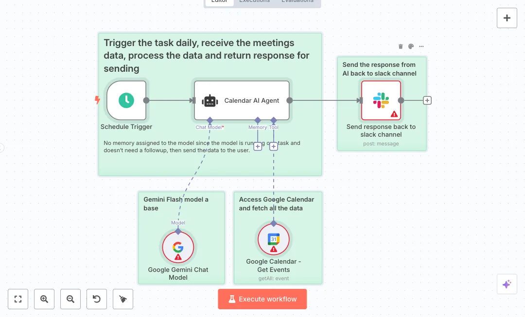 At 9 AM a schedule starts an AI agent powered by a Gemini Flash model. The agent pulls today’s events from Google Calendar using a Get Events tool with time windows set from the start to the end of the day. It then writes a short, clean summary. The message is posted to a chosen Slack channel so everyone has the same view of the day.