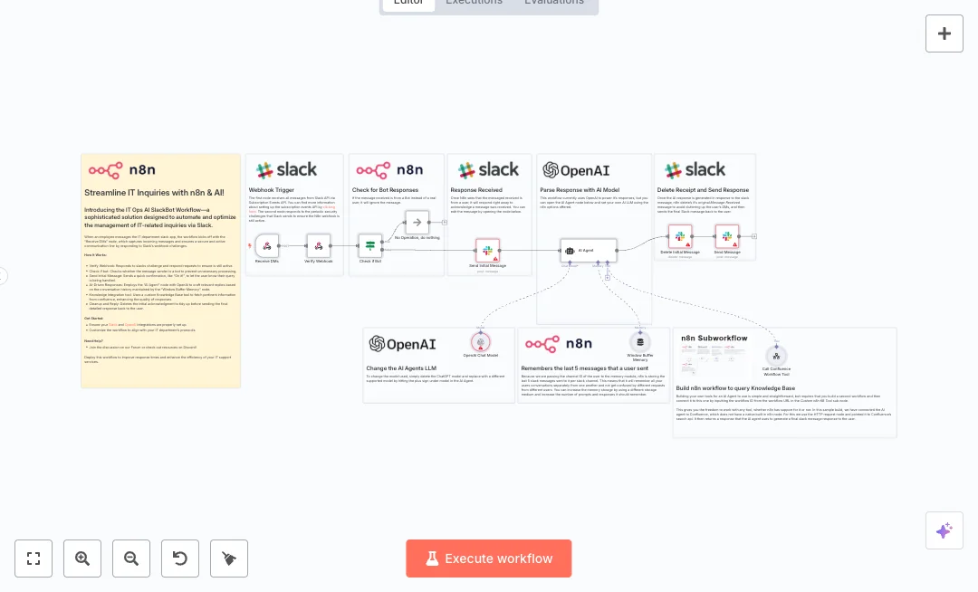 Set up requires a Slack app with Events API enabled, an OpenAI API key, and a separate n8n workflow that queries Confluence. Teams can expect faster first responses, fewer repeated questions, and cleaner DMs. Use it for IT helpdesk DMs, onboarding FAQs, and policy lookups where people prefer quick answers in Slack.