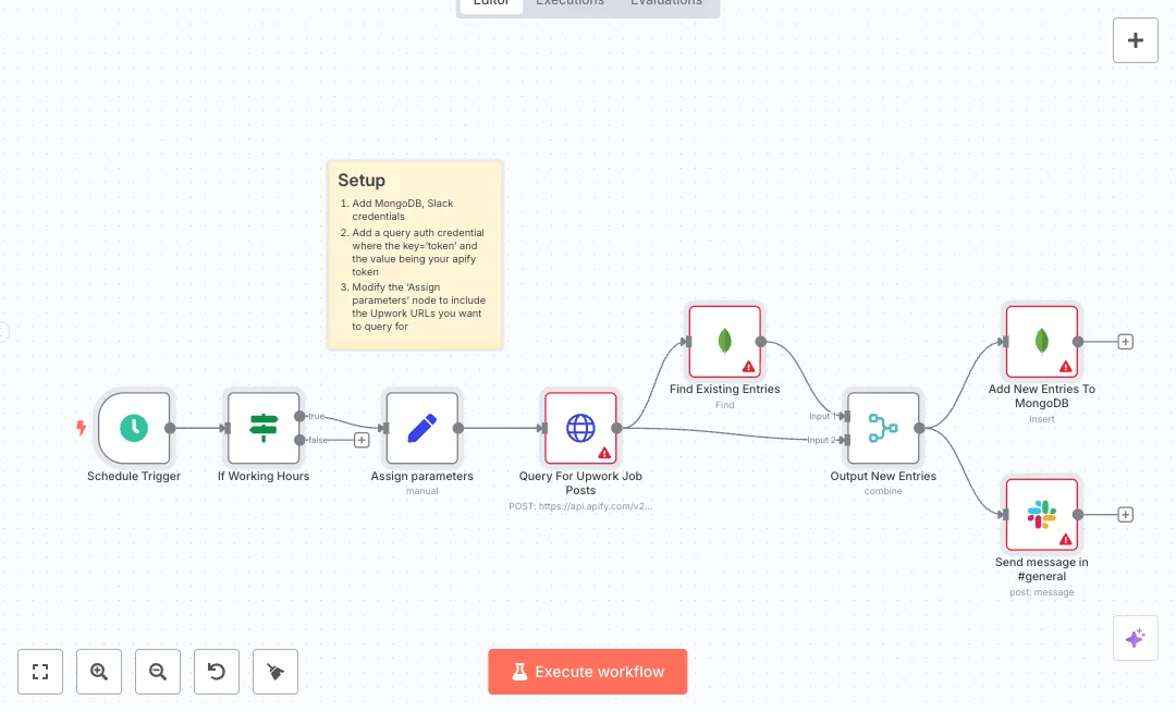 You will need an Apify token, a MongoDB connection string, and a Slack app or bot with access to your channel. Add your own search URLs and adjust the work hour rule to match your time zone. Expect faster lead response, less manual checking, and reduced duplicate alerts. Great for small sales teams, agencies, and solo consultants who monitor online job boards for service work.