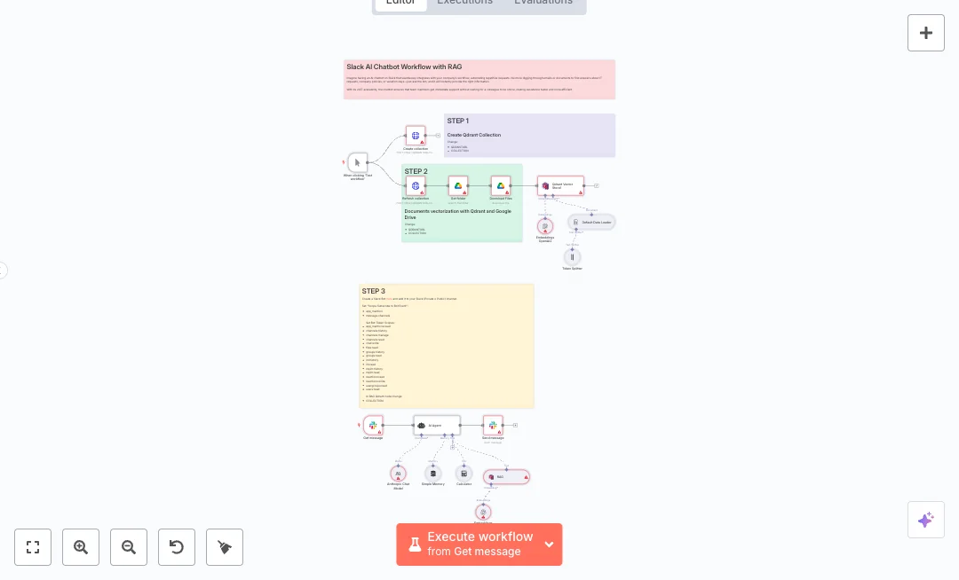 The flow listens to app mentions in Slack and passes the message to an AI agent powered by Anthropic. A short chat memory is kept per channel and user, so follow up questions stay in context. A retrieval tool searches a Qdrant vector database for the top matching document chunks, then the agent writes the final reply. Your Google Drive files are loaded, split into small parts, embedded with OpenAI, and saved into Qdrant. HTTP calls create and refresh the Qdrant collection, and replies return to Slack in a thread with clean formatting.