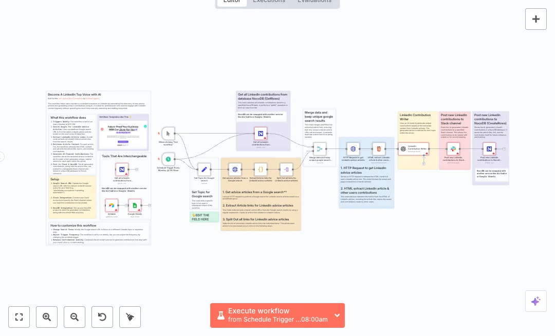 Every Monday at 8am or on demand, a Google search collects fresh results. Code extracts only LinkedIn advice links, then a merge step removes duplicates by checking what is already stored in NocoDB. Each link is fetched, the HTML node pulls the title and topics, and OpenAI writes short, original contributions. The output goes to a chosen Slack channel and into NocoDB as new rows.