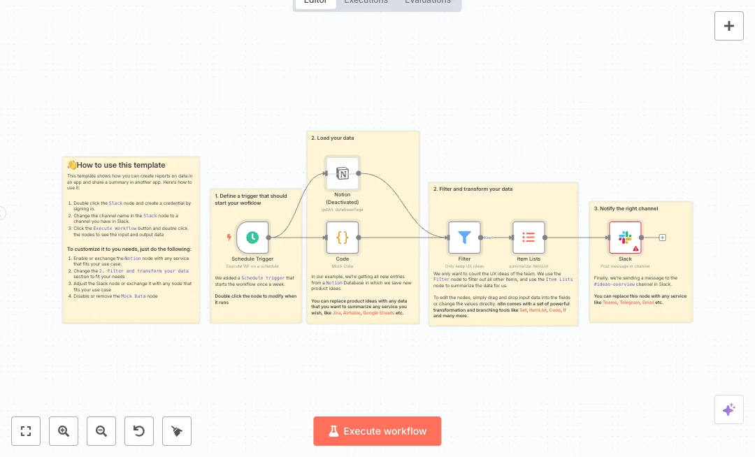 A schedule starts the run once a week. The workflow pulls recent pages from a Notion database using a created time filter for the last seven days. It keeps only items where the idea type includes UX, then summarizes the data with a unique count of idea IDs. Finally, it posts a simple message in Slack that shows the total. A mock data node is included for safe testing before you connect your live Notion data.