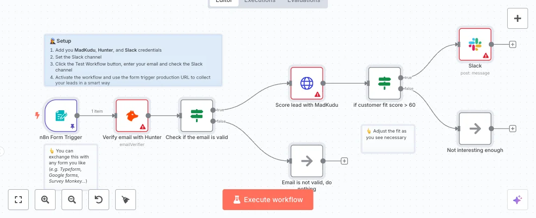 An n8n form captures a business email. The email is sent to Hunter to verify deliverability and validity. If the email passes, the flow calls MadKudu to fetch a customer fit score using the email. When the score is over 60, a detailed message posts to your Slack channel with the person and company context from the scoring data. If the email is invalid or the score is below the threshold, the run ends quietly with no Slack post.