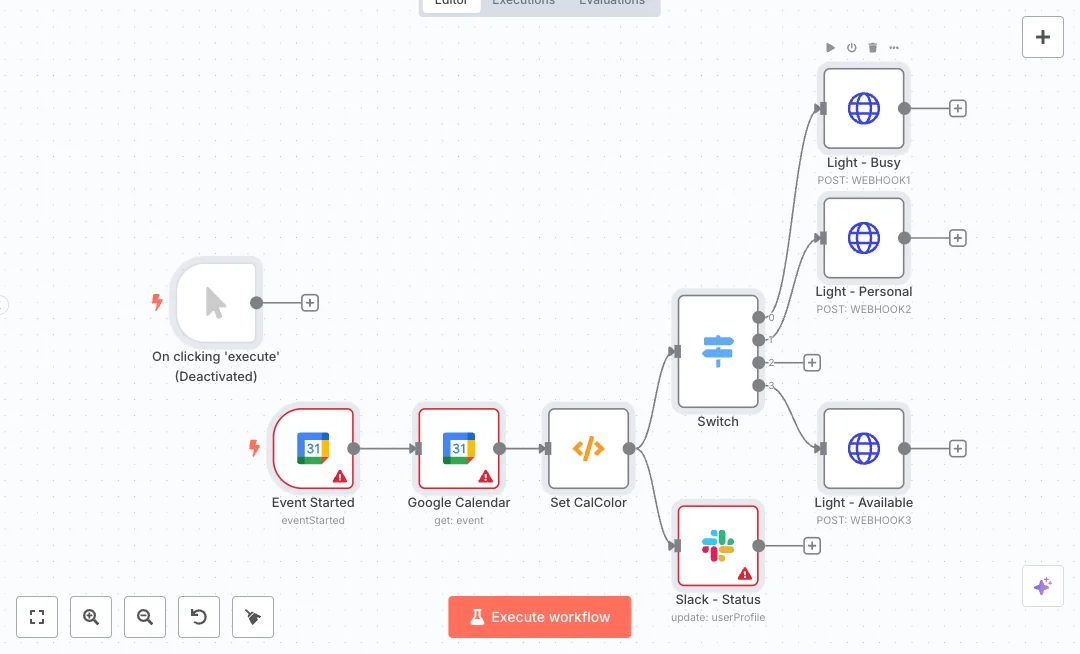 The flow checks Google Calendar for events that have just started every five minutes. It pulls the event details, reads the calendar color, and turns it into a simple label like leading, managing, or doing. Slack sets your status text to the event title and uses a matching emoji. A switch then routes to one of three HTTP requests that call your light webhooks to set busy, personal, or available. A manual trigger is also included for quick testing.