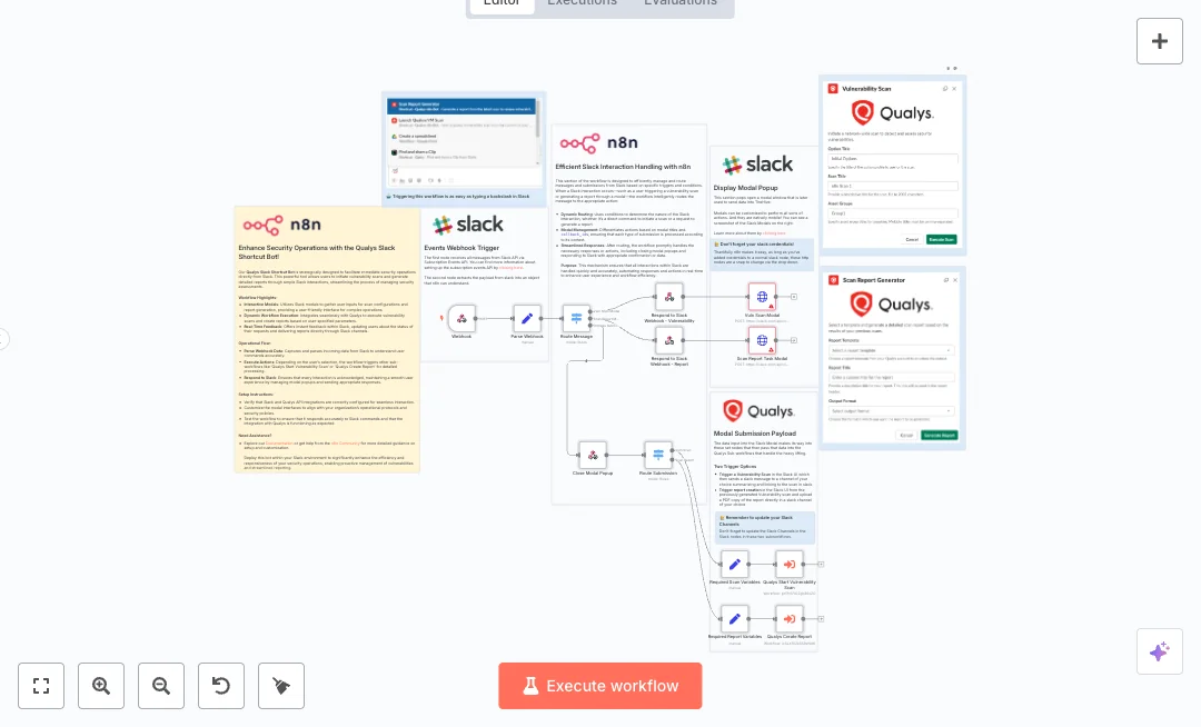 Incoming Slack events hit an n8n webhook, then a Set node parses the payload so the data is easy to work with. A Switch node routes the request. n8n replies to Slack right away, then opens the right modal with HTTP calls to Slack views.open. After a user submits the form, the flow closes the modal, maps fields into clean variables, and calls sub workflows to start a vulnerability scan or generate a report in Qualys. Status messages and outputs flow back into Slack as configured in the sub workflows.