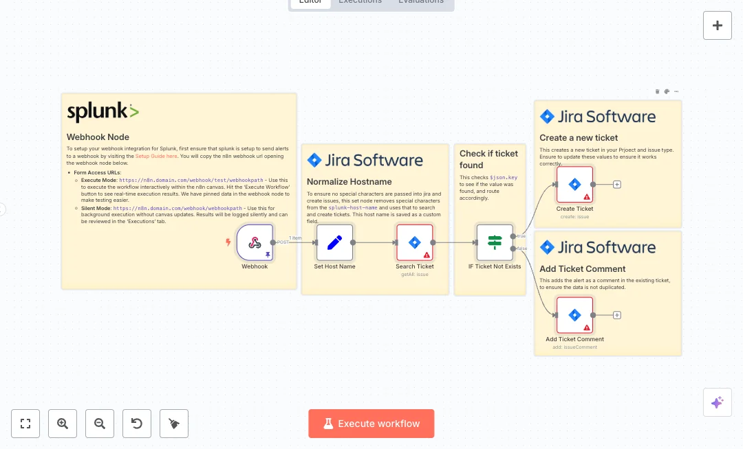You will need Jira Software Cloud and Splunk. Point the Splunk webhook to the n8n URL and confirm your Jira custom field name for the host. Expect fewer duplicate tickets, faster handoff, and a clear audit trail of updates. It fits teams that face repeated alerts from the same host, rapid bursts of events, or ongoing investigations that need a single source of truth.