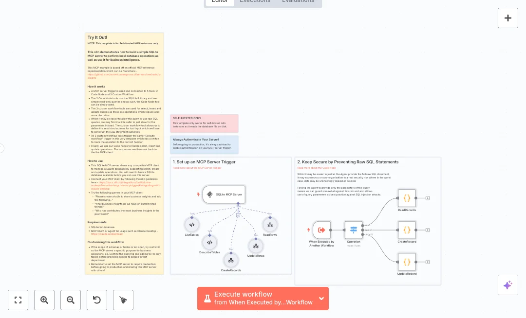 The setup uses an MCP Server trigger that offers five tools. Two tools list and describe tables using read only code. Three tools handle read, create, and update with a routed call into an internal execution trigger. A switch node directs the request to the right code block. Each code node builds queries from parameters, not raw SQL, and runs them with the sqlite3 library against a local file. This design reduces risk, keeps structure consistent, and returns clean results to the client.