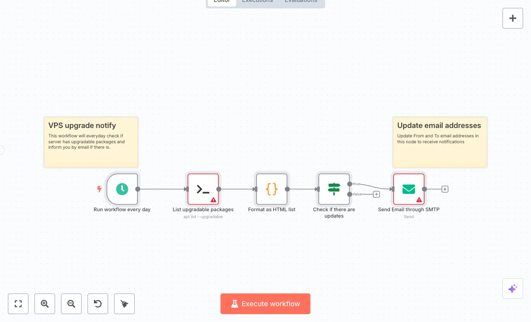 You need SSH access to the server and an SMTP account that can send mail from your domain. Set the email addresses in the mail step and connect both credentials in n8n. Expect fewer missed patches and less time spent logging in to each box. Good fits include small teams with one or more VPS, managed service providers, and founders who run their own Linux boxes. Many users cut daily checks from minutes per server to near zero.