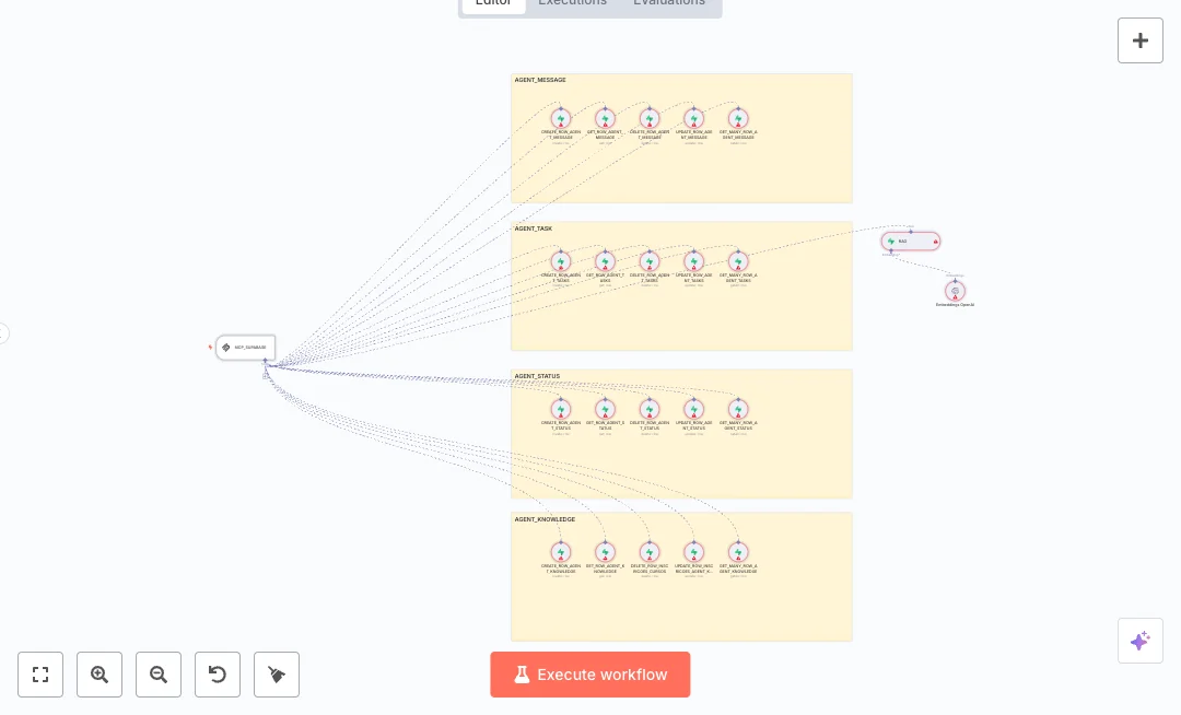 The flow starts with an MCP trigger that exposes database tools to your agent runtime. Supabase handles storage across four tables for messages, tasks, status, and knowledge. A vector search tool reads from a documents table using OpenAI embeddings, set to return the top five matches. CRUD nodes manage create, read, update, and delete actions for each table, so your agent can log, fetch history, update progress, and prune stale records without manual work.
