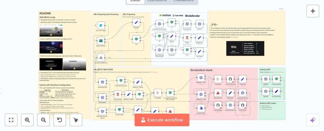 The flow starts from an n8n form or a webhook. It reads your settings like image mode, dark mode, brand text, slug, tags, and folder. It pulls page data from multiple sources, including OpenGraph, Dub, and direct header parsing. If metadata is weak, it tries more methods until it gets a title, description, and image. You can enable screenshots to build a custom OG image, or use the page source or a brand card. Screenshots and icons are saved to GitHub, then the link is created or updated in Switchy. Safety checks run across Norton Safe Web, Bitdefender, PhishTank, and a community scanner. If the link is unsafe, it stops.