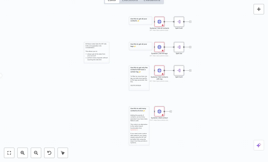 Under the hood it uses HTTP requests to the Systeme.io API. Contacts, tags, and tagged contacts are fetched with safe pagination settings and a short wait between calls, so rate limits are not hit. Split nodes break the items into single records for easy processing. A final request adds new contacts when you load a list. You get reliable full data pulls and precise tag based lists that are ready for campaigns.