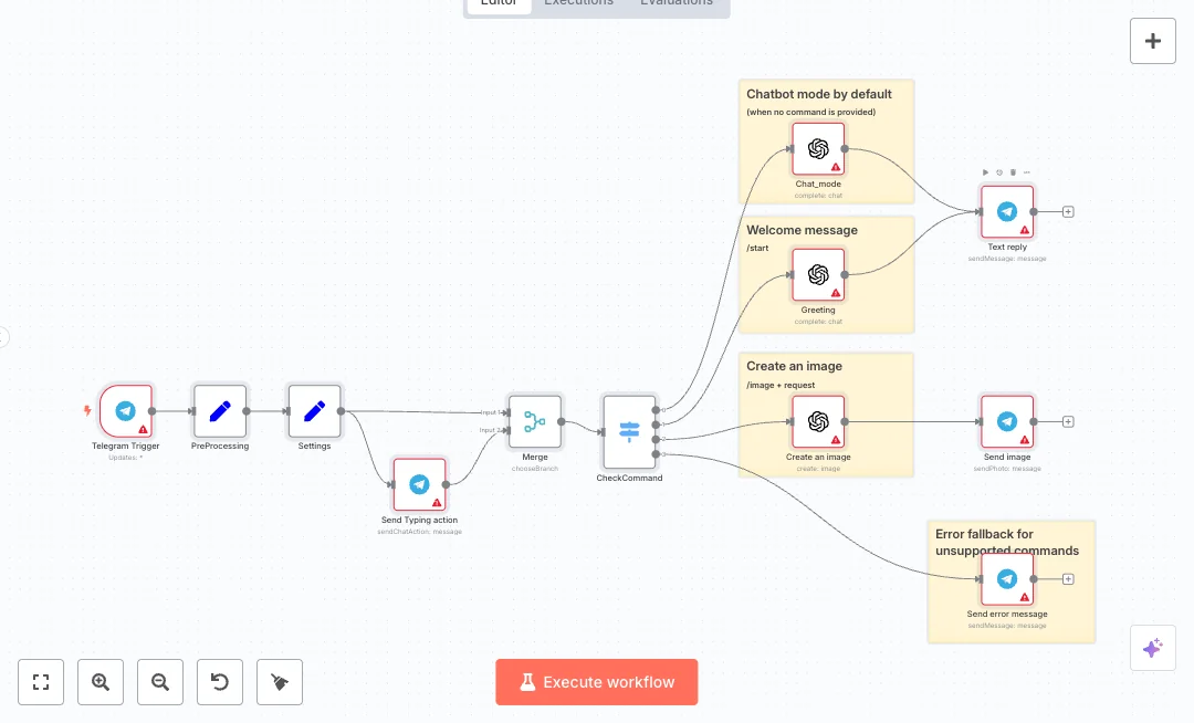 When a message arrives in Telegram, the bot sends a typing signal and routes the text with a command check. Free text triggers AI chat using a system prompt, temperature, and token limits that you control. The command start sends a warm welcome in the user language, and image builds a picture from the prompt and posts it back. Unknown commands get a helpful error reply, and messages use Markdown for clear formatting. A merge step coordinates the typing action and routing so messages flow smoothly.