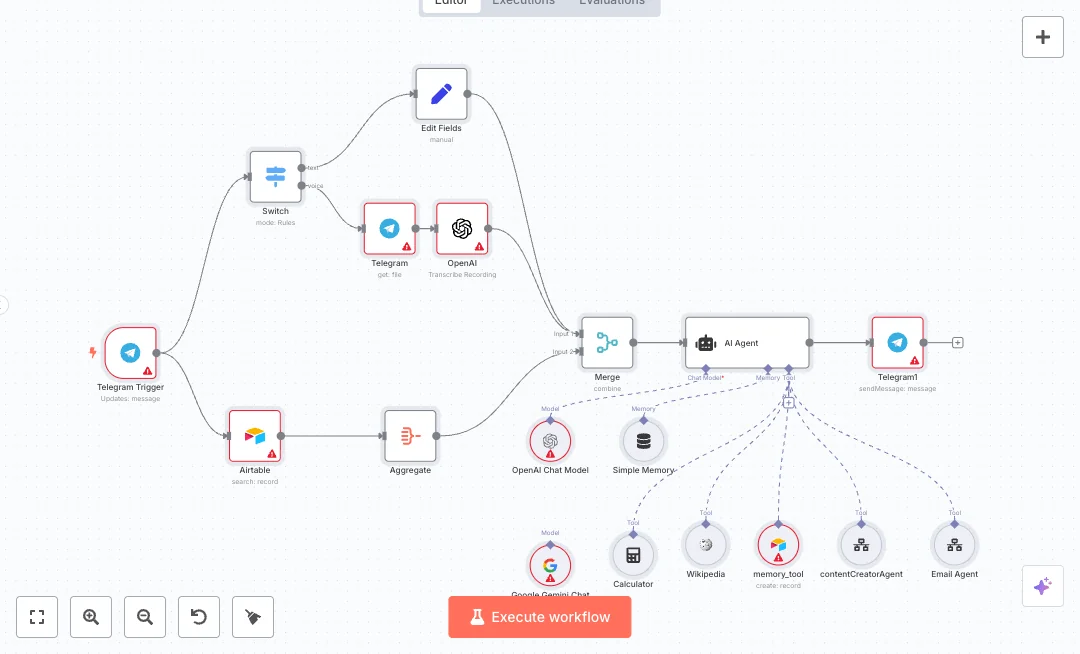 When a message arrives, Telegram collects the update. Text goes straight into a text field, and voice notes go to OpenAI for transcription. Past notes are pulled from Airtable and combined with the new input. An AI Agent powered by an OpenAI chat model writes the answer. The agent can use a calculator for quick math and Wikipedia for quick facts. It can also save a short 140 character memory back into Airtable for future context. The reply is sent back to Telegram right away.