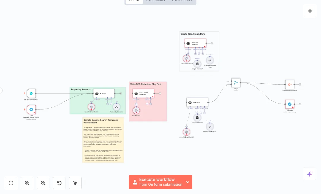 The flow starts with two inputs. A form submission or a Telegram message triggers AI agents powered by OpenAI to research and write. A research tool workflow called Perplexity Searcher brings in fresh insights. A structured parser then produces a clean slug, title, and meta description. Merge and aggregate steps bundle the draft and metadata. Memory nodes keep context across agents so tone and details stay aligned. The final package is posted to a Telegram channel for quick approval or edits.