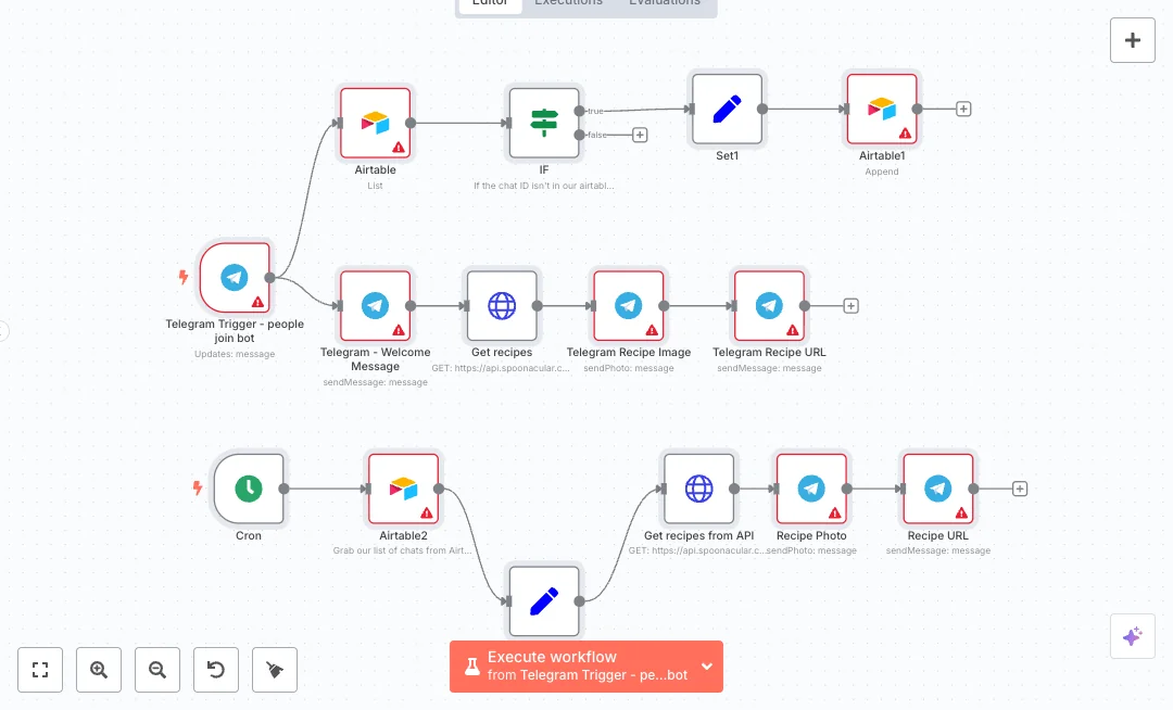 When someone starts your bot, a Telegram event fires, sends a welcome message, and fetches a random vegan recipe from the recipes API. The chat ID and first name are written to Airtable only if they are not already there. Each day a schedule runs, pulls all chat IDs from Airtable, gets a new recipe, and sends a photo and a link to every subscriber. The flow uses Telegram for messages, Airtable for the list, and an HTTP call to the recipes API for fresh content. This keeps posting consistent and removes manual copy and paste.