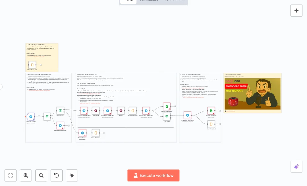 Setup needs a Telegram bot and access to a Google Sheet. Timing can be adjusted by changing the wait node values. Expect less manual tracking, better focus habits, and a simple sheet for reporting. Useful for remote teams, agencies, and study groups that already use Telegram for daily work.
