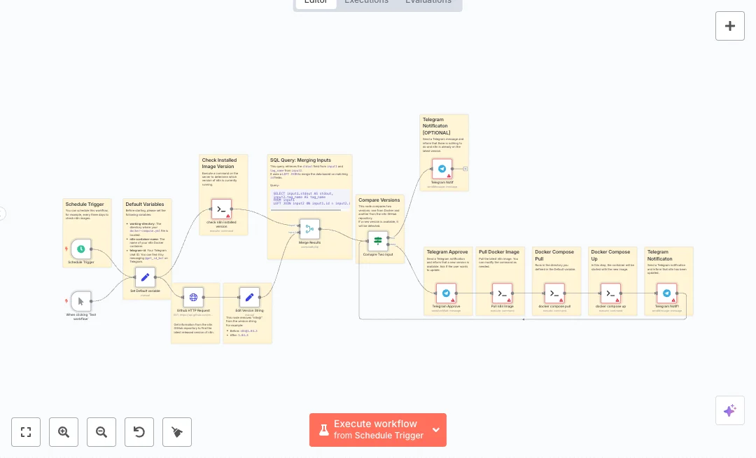 A schedule runs every three days or you can start it by hand. Default variables store your server folder, container name, and Telegram chat id. The flow pulls the latest release tag from GitHub, removes extra text from the tag, and reads the installed version from Docker over SSH. Results are merged and compared. If versions match, a Telegram note confirms no action. If a newer build exists, Telegram asks for approval. On approval, the server pulls the new image, runs docker compose pull and up in the right folder, and then sends a success message in Telegram.