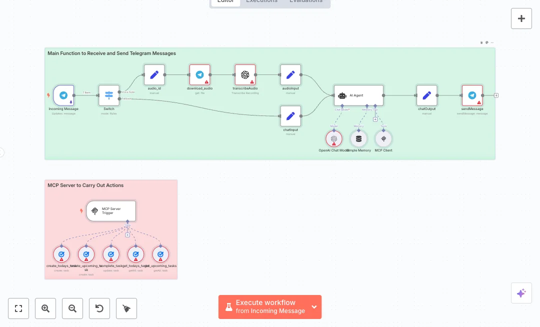 Incoming Telegram messages start the flow. A Switch node checks if you sent text or a voice note. Voice notes are downloaded and transcribed by OpenAI, while text goes straight in. The AI agent uses OpenAI with short term memory per user and calls Google Tasks tools through an MCP bridge to get lists, create new tasks for today or upcoming, and update tasks only after pulling the right IDs. Replies are sent back to Telegram so you see results in chat.