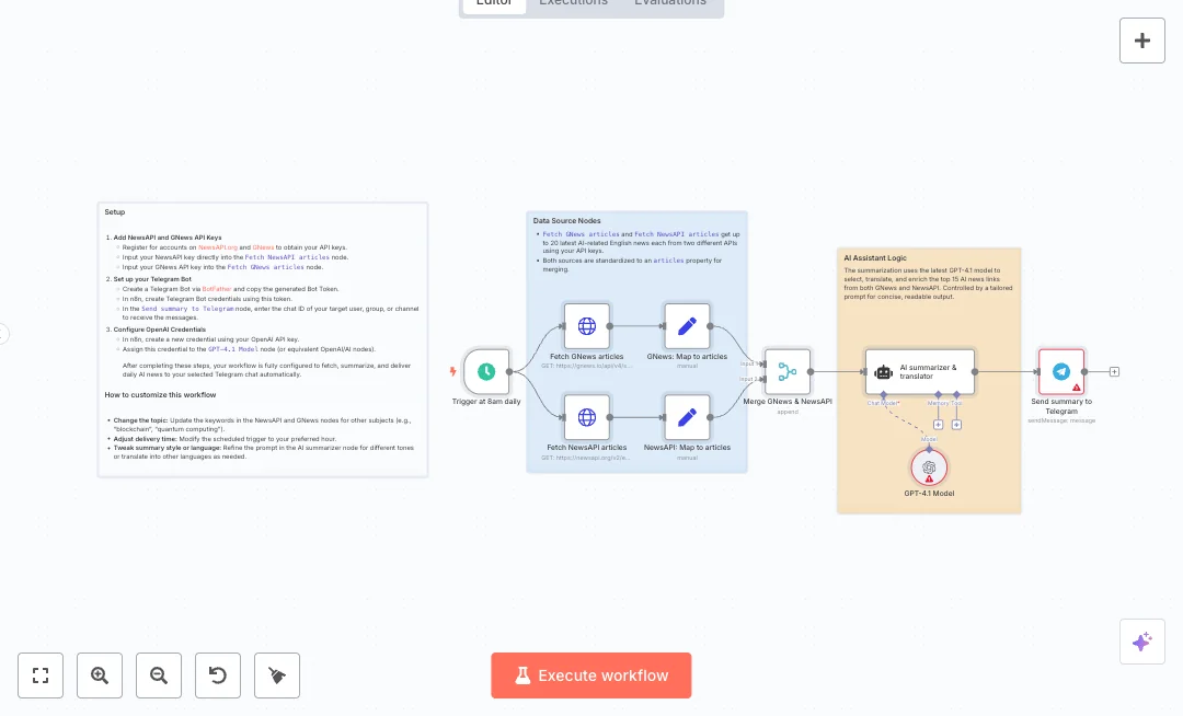A daily schedule at 8 am starts the run. Two HTTP calls pull English AI news from GNews and NewsAPI. Set nodes normalize both feeds into the same articles field, then a Merge node combines them. An AI agent using GPT 4.1 ranks the best 15 links, writes short summaries, and translates them. The final digest is posted to your chosen Telegram chat. You get broader coverage, a consistent format, and content ready for Chinese speaking readers.