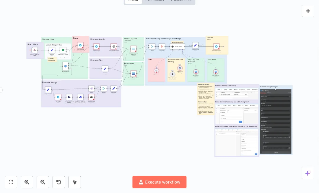 A Telegram webhook listens for new messages. A router checks if the message is text, an image, or audio. Audio files are downloaded from Telegram and sent to OpenAI for transcription. Images are fetched and analyzed by OpenAI to produce captions and details. All content flows into an AI agent powered by GPT 4o mini. The agent reads short term chat memory from Postgres, pulls long term memories and notes from Baserow, and can save new notes or memories back to Baserow. Merge and Aggregate nodes shape the final answer, which is sent back to Telegram with clean formatting. A user check step blocks unknown users and sends a clear error message.