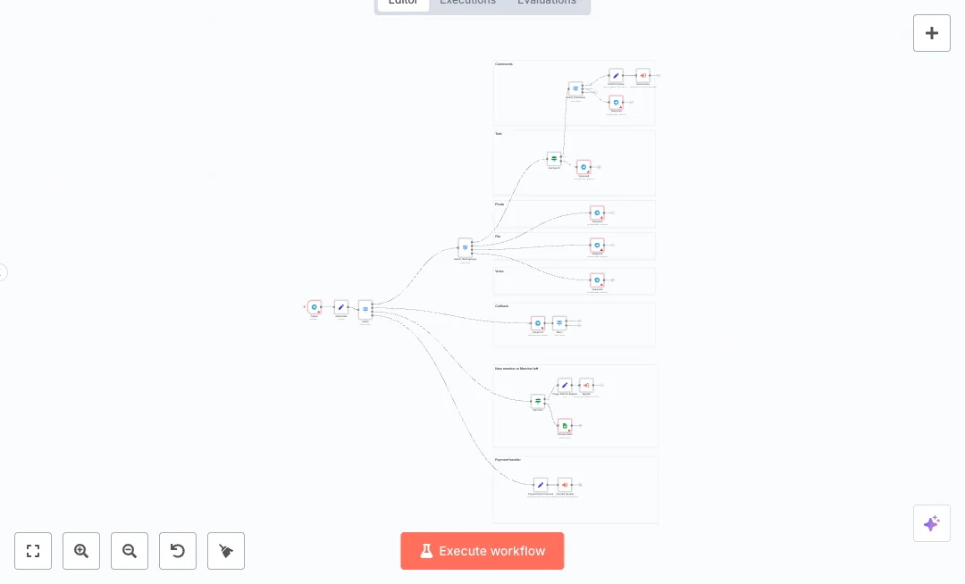A Telegram event starts the flow. Switch nodes sort updates by text, photo, file, voice, and button clicks, so each path responds the right way. Command checks route people to menus, registration, or invoicing. Two child workflows handle registration and payments for clean separation. A Google Sheets step updates status so your team sees each user’s stage. Invoice data is prepared and sent back to the same chat, and standard replies cover each content type.