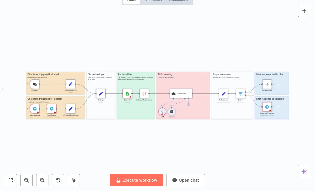Two inputs can start the chat. People can message your Telegram bot, or you can test inside n8n chat. The flow grabs the latest schedule from Google Sheets, converts it into a simple table, and passes it to an AI chat agent. The agent uses memory to keep context across messages and writes clear replies. A typing indicator shows users that a response is coming, and a switch sends the final message back to Telegram or to the n8n chat window.