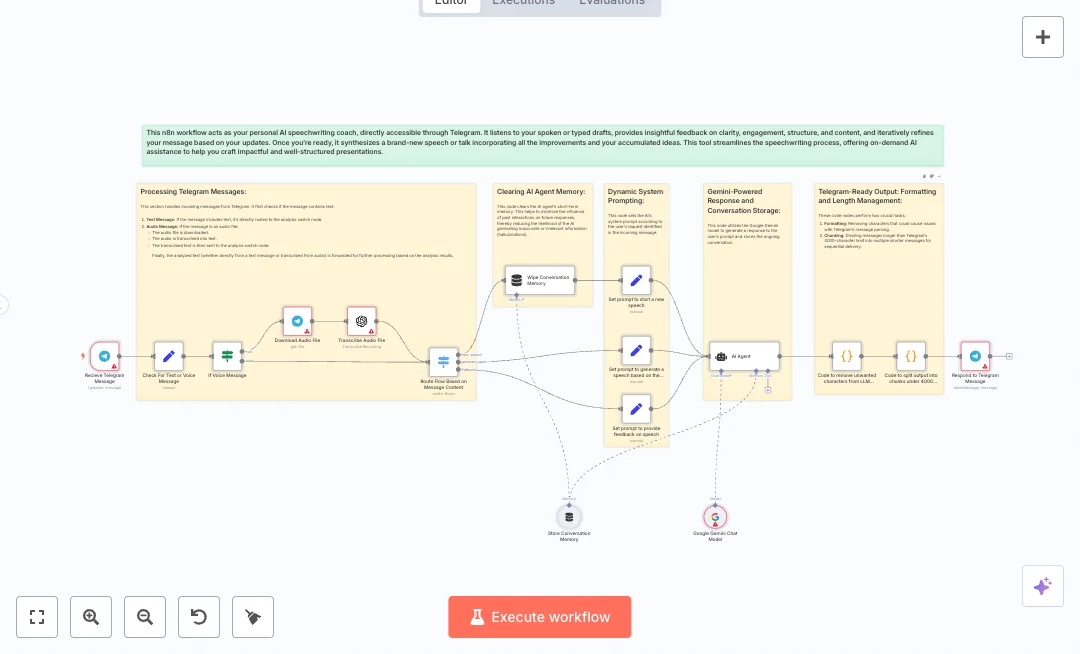 Messages from Telegram start the process. Text goes straight to analysis. Voice notes are downloaded and transcribed to text with OpenAI. A switch routes the text to one of three roles: start a new speech, give feedback, or produce a refined speech from feedback. The Google Gemini model writes the reply, while a memory window keeps recent context and a reset step can wipe it when needed. Two code steps clean special characters and split long answers into parts under 4000 characters so Telegram can deliver them in order. The system answers back in the same chat.